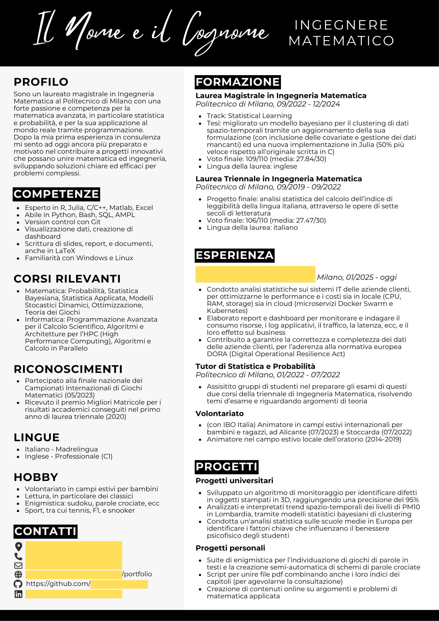 Come software, potete dunque usare Canva, come ho fatto io, in modo da avere il totale controllo su allineamenti, spaziature, font, colori, link, ecc, o altrimenti qualche template di LaTeX che trovate ad esempio su Overleaf.