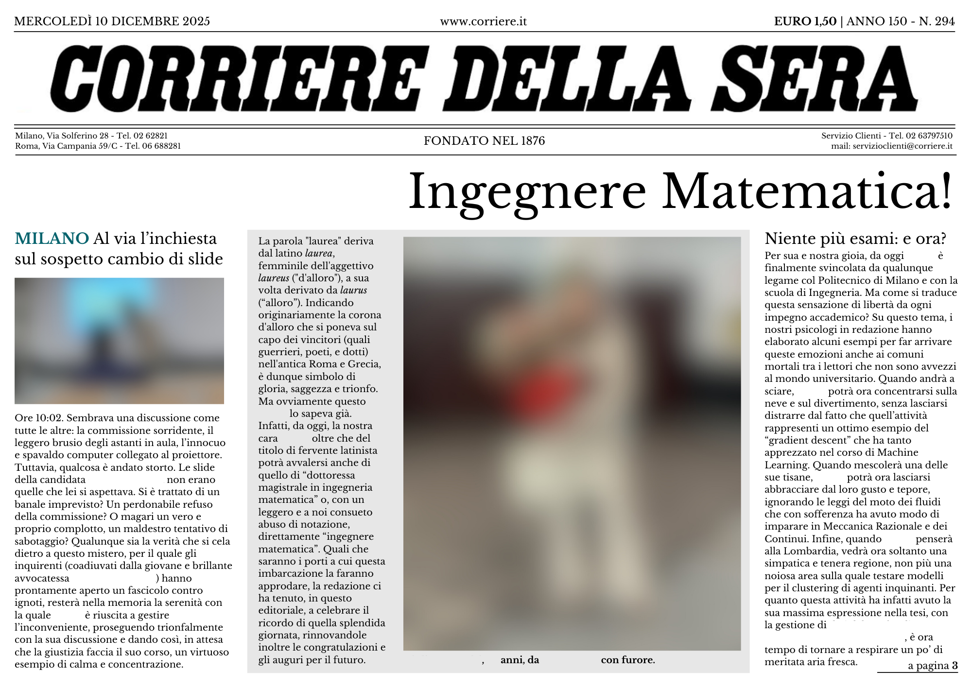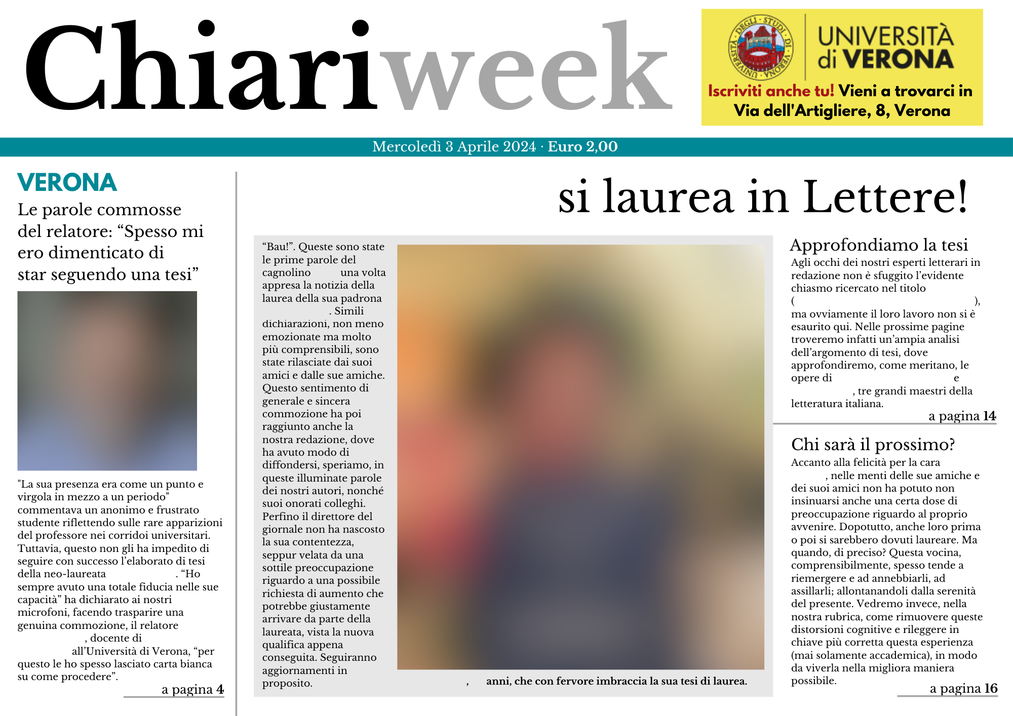 In genere la laurea si accompagna con un brindisi, a volte delle bomboniere, una festa, ecc, tuttavia nel mio piccolo ho avuto l'idea, in questi anni, di celebrarla in modo simpatico consegnando al laureato anche una "finta prima pagina di giornale", proprio stampata e addirittura incorniciata, che simulasse lo scenario in cui perfino i quotidiani nazionali o locali si mobilitavano per onorare questo splendido evento. Il tutto è quindi proposto in chiave molto ironica, come si può intuire dal tono leggero ma in stile giornalistico dei vari articoletti, dal banner pubblicitario dell'università casualmente finito proprio in quell'edizione del giornale, e dall'accurata veste grafica sapientemente redatta con Canva.